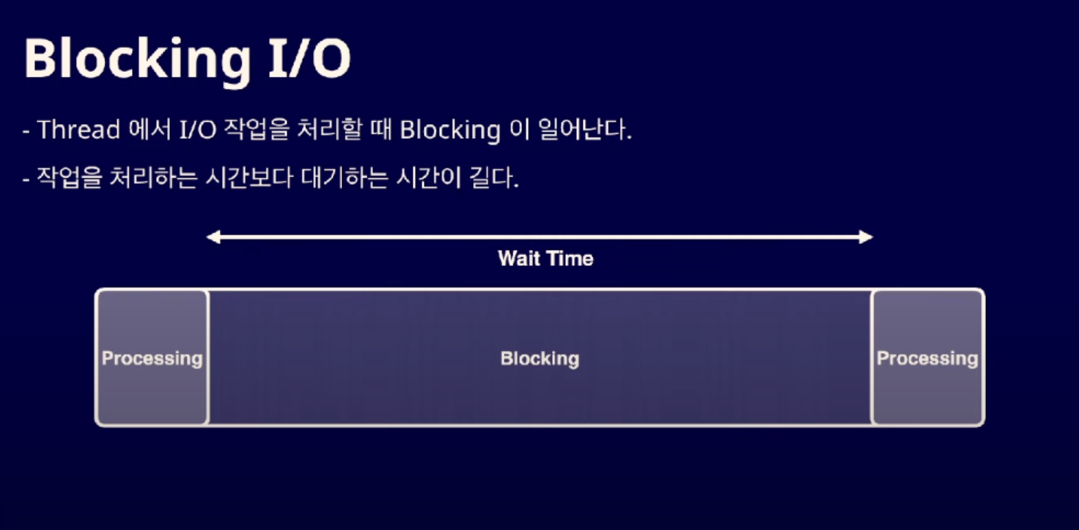 또한 Blocking I/O 문제도 있다. 스레드에서 I/O 작업을 처리할 때 Blocking이 일어나는데, 작업을 처리하는 시간보다 대기하는 시간이 훨씬 길어 효율적으로 사용할 수 없는 문제가 발생했다.