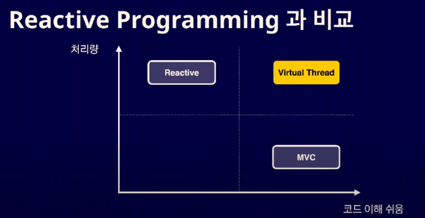가상 스레드는 Reactive 스타일의 ‘높은 처리량’과 MVC 스타일의 ‘동기적인 코드 작성’이라는 두 장점을 모두 취할 수 있다.
