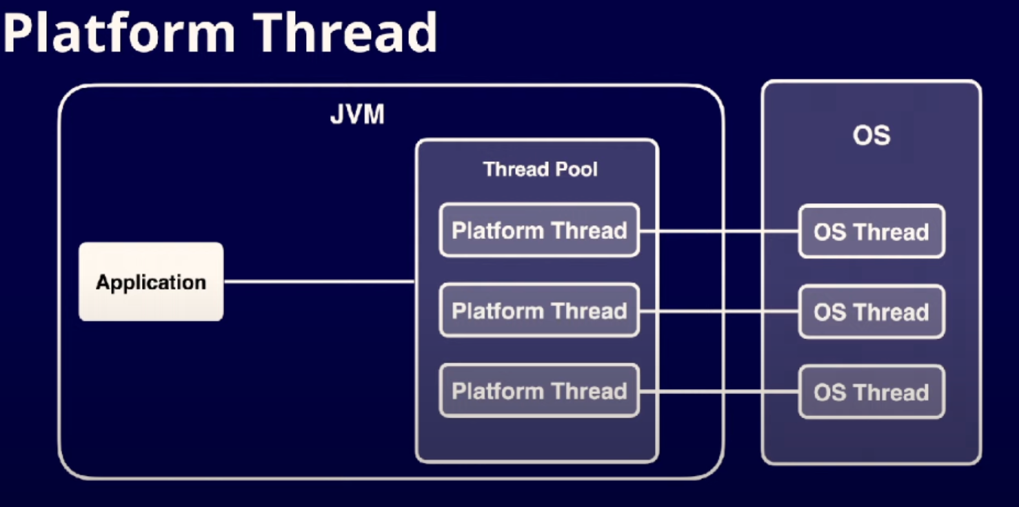 플랫폼 스레드는 애플리케이션이 스레드 풀안의 플랫폼 스레드를 사용하여 OS 스레드와 1:1로 매핑되는 구조를 가진다.