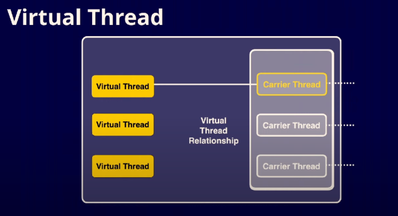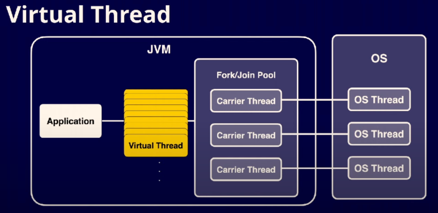 반면 가상 스레드는 JVM 내부에서 가상 스레드가 따로 존재하여 folk/join 풀에 캐리어 스레드를 두고 사용한다.