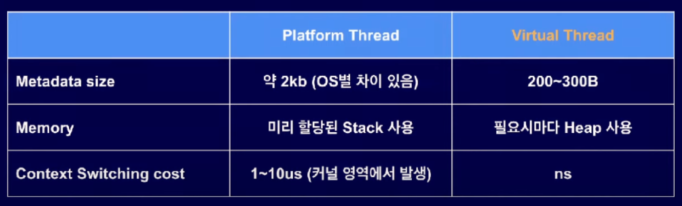 이는 OS 스레드는 개수의 제한에 있지만, 가상 스레드의 수는 수십~수백만개까지 생성하여 사용할 수 있다.
