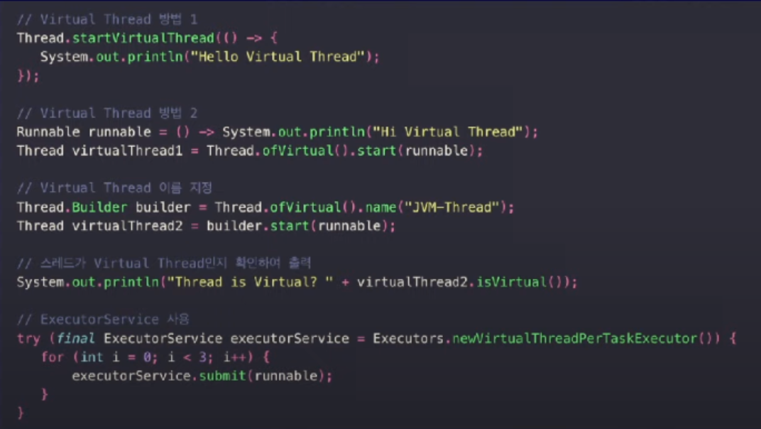 JDK 21에 추가된 경량 스레드(Thread) OS 스레드를 그대로 사용하지 않고 JVM 내부 스케줄링을 통해 수십만~수백만개 동시에 사용할 수 있게 한다.