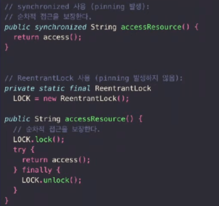 pinning을 회피하기 위해서는 synchnized 작성된 코드를 ReemtrantLock으로 우회하는 방식이 있다.