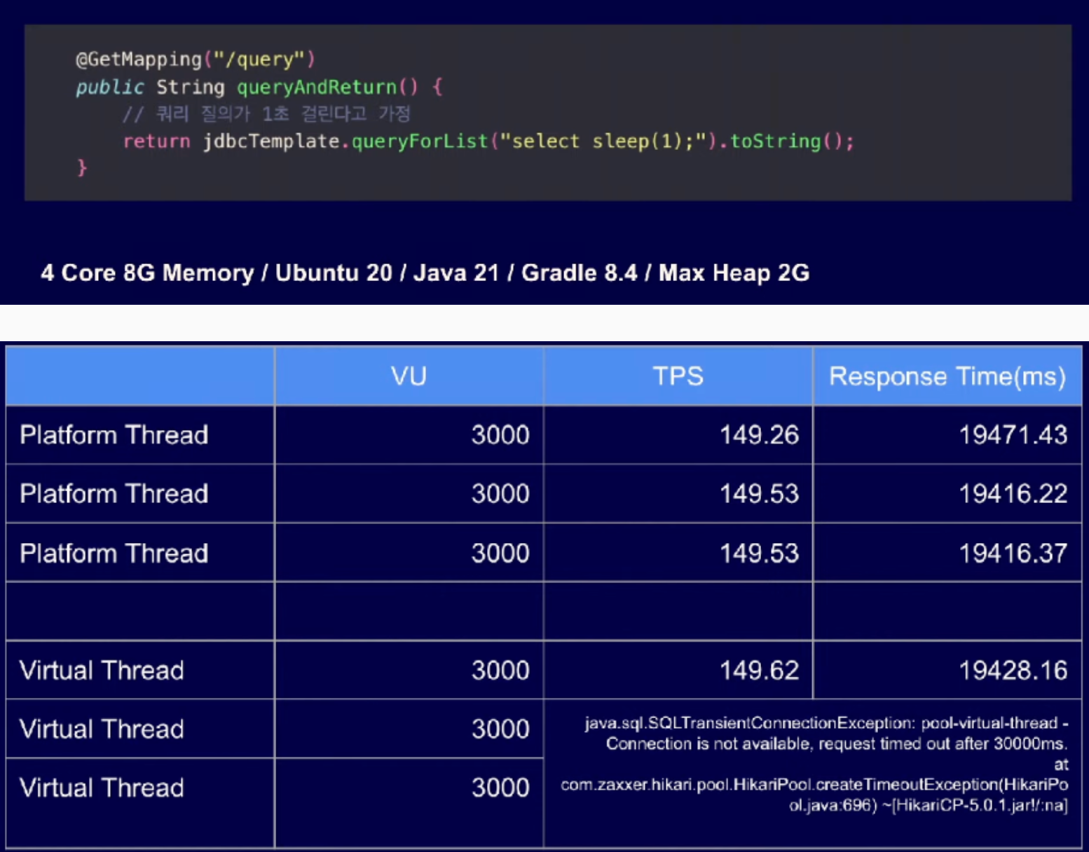 플랫폼 스레드에서는 톰캣이 요청을 수행하다가 충분한 트래픽을 받지 못하면 기다려야하는 상황이 발생했는데, 가상 스레드는 처리량을 모두 소화하고, DB 커넥션을 기다리다가 타임아웃이 발생하여 예외가 발생했다.