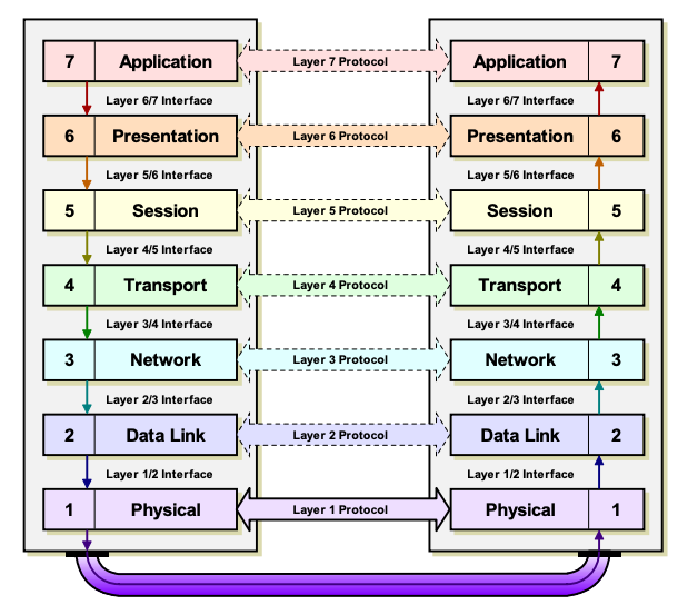 OSI 모델은 프로토콜(protocol)과 인터페이스(interface)라는 두 가지 개념을 사용하여 계층 간의 상호작용을 설명합니다.