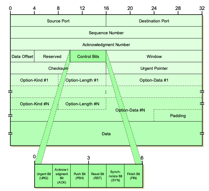 데이터 오프셋 필드는 20 - 60 bytes의 값을 표현할 수 있다고 했는데, 아무런 옵션도 사용하지 않은 헤더의 길이, 즉 Source Port 필드부터 Urgent Pointer 필드까지의 길이가 20 bytes이고, 옵션을 모두 사용했을 때 옵션 필드의 최대 길이가 40 bytes이기 때문입니다.