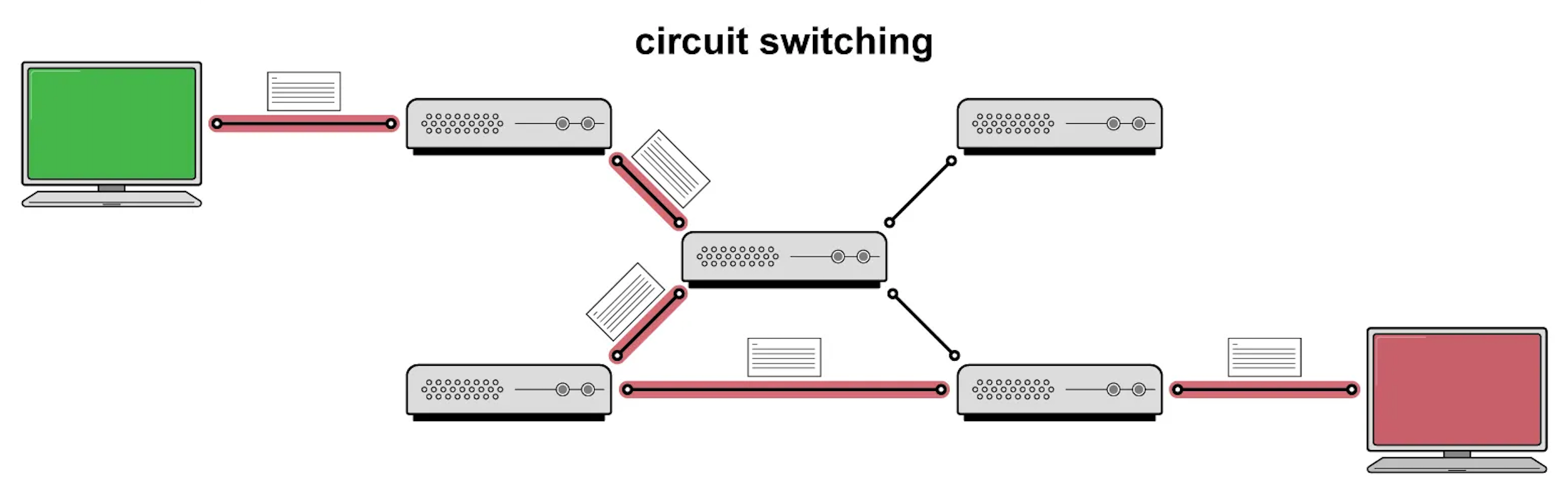 회선 교환 방식은 point-to-point 방식으로 연결되기 때문에 송신자의 모든 데이터는 동일한 경로로 전송하는데, 통신 중에 중간 경로에 문제가 생긴다면 전체 연결이 끊어져서 새로운 회선을 할당해야 하는 문제점이 있었습니다.