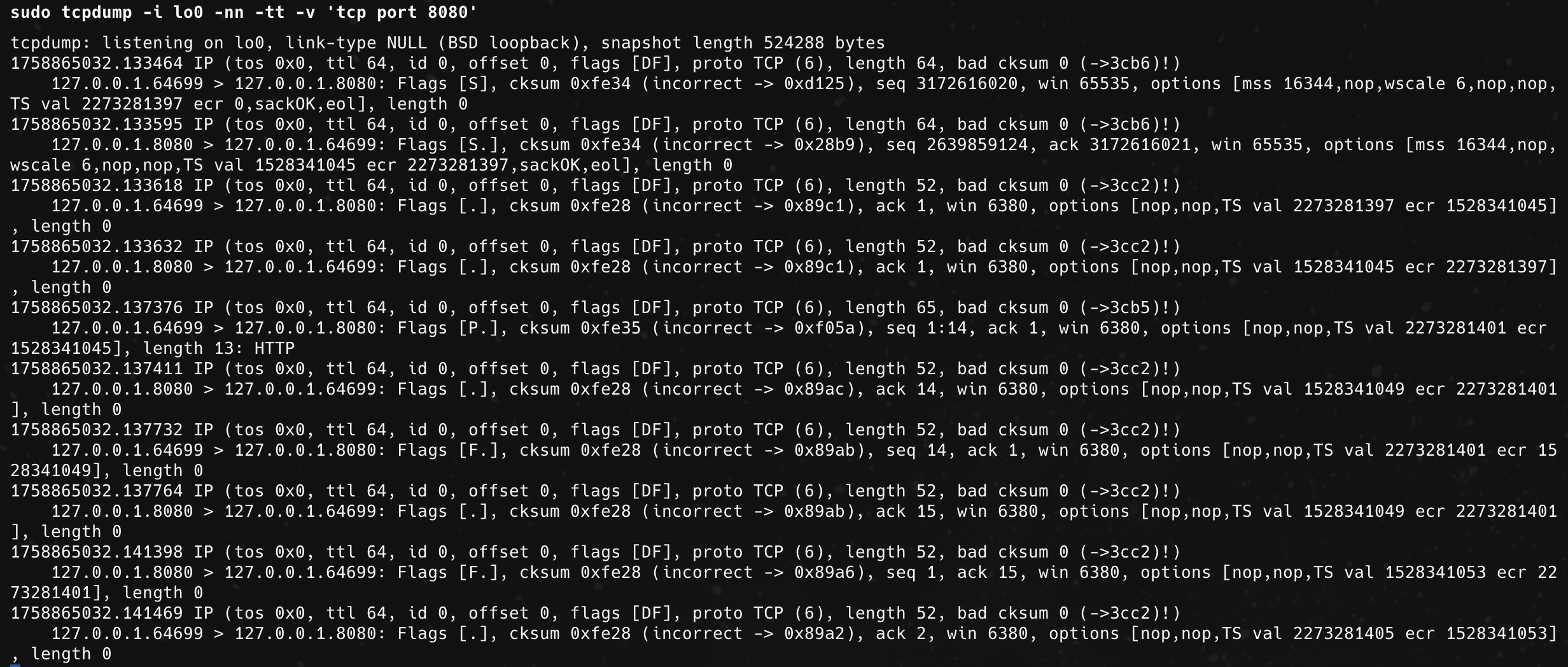 127.0.0.1.64699 > 127.0.0.1.8080: Flags [.], cksum 0xfe28 (incorrect -> 0x89c1), ack 2639859125, win 6380클라이언트는 서버의 SYN을 수신하고, 이에 대한 ACK을 보내는데, 이때 ACK 번호는 서버 ISN+1 (2639859124+1 = 2639859125)이 됩니다.